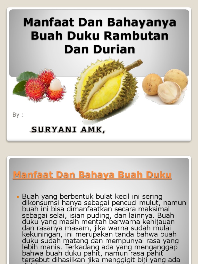 Manfaat dan bahaya makan buah duku. Perlu diketahui duku adalah buah yang mengandung banyak nutrisi vitamin dan mineral yang sangat penting bagi tubuh. Selain itu buah Duku dapat membuat gigi lebih kuat dan lebih segar karena kandungan fosfornya. Kandungan Gizi Buah Duku.