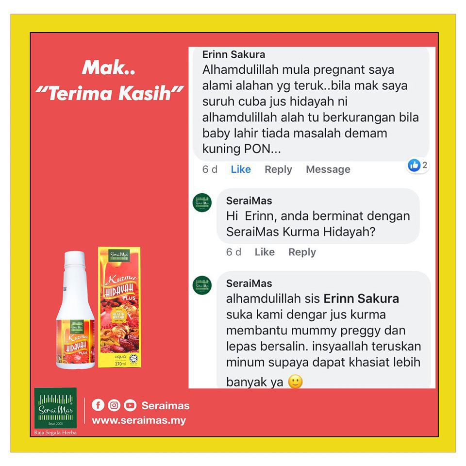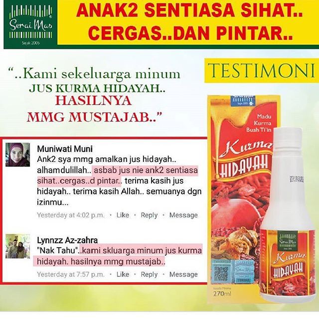 Jus Kurma Hidayah amat sesuai jika pengambilannya diteruskan dan. Produk keluaran terbaru Jus Hidayah daripada ektrak buah tinmadukurmahabbatus sawdasarang burung anggur merahkismis merah buah badam dan buah delima banyak mengandungi khasiat. Jus Kurma Hidayah keluaran Serai Mas menjadi amalan seisi keluarga yang mementingkan kesihatan.